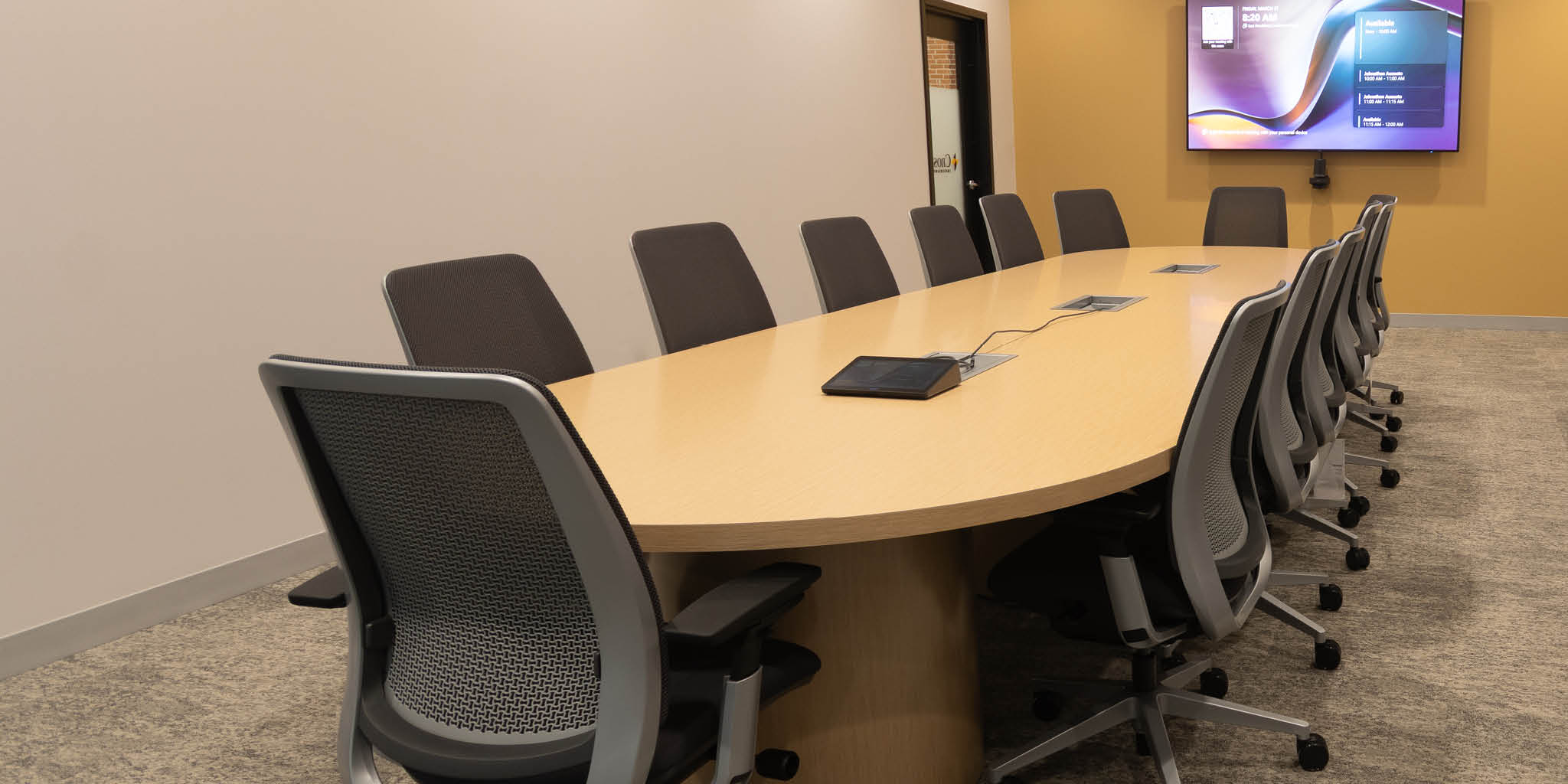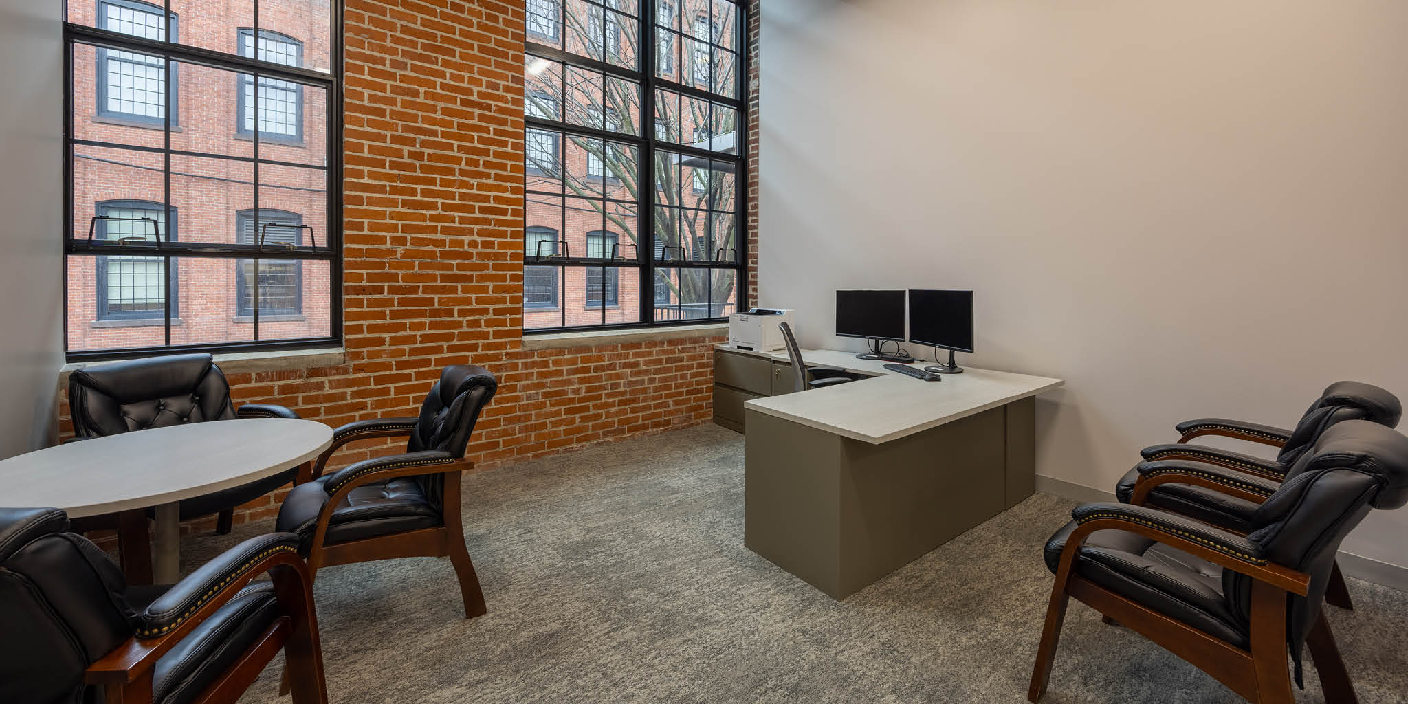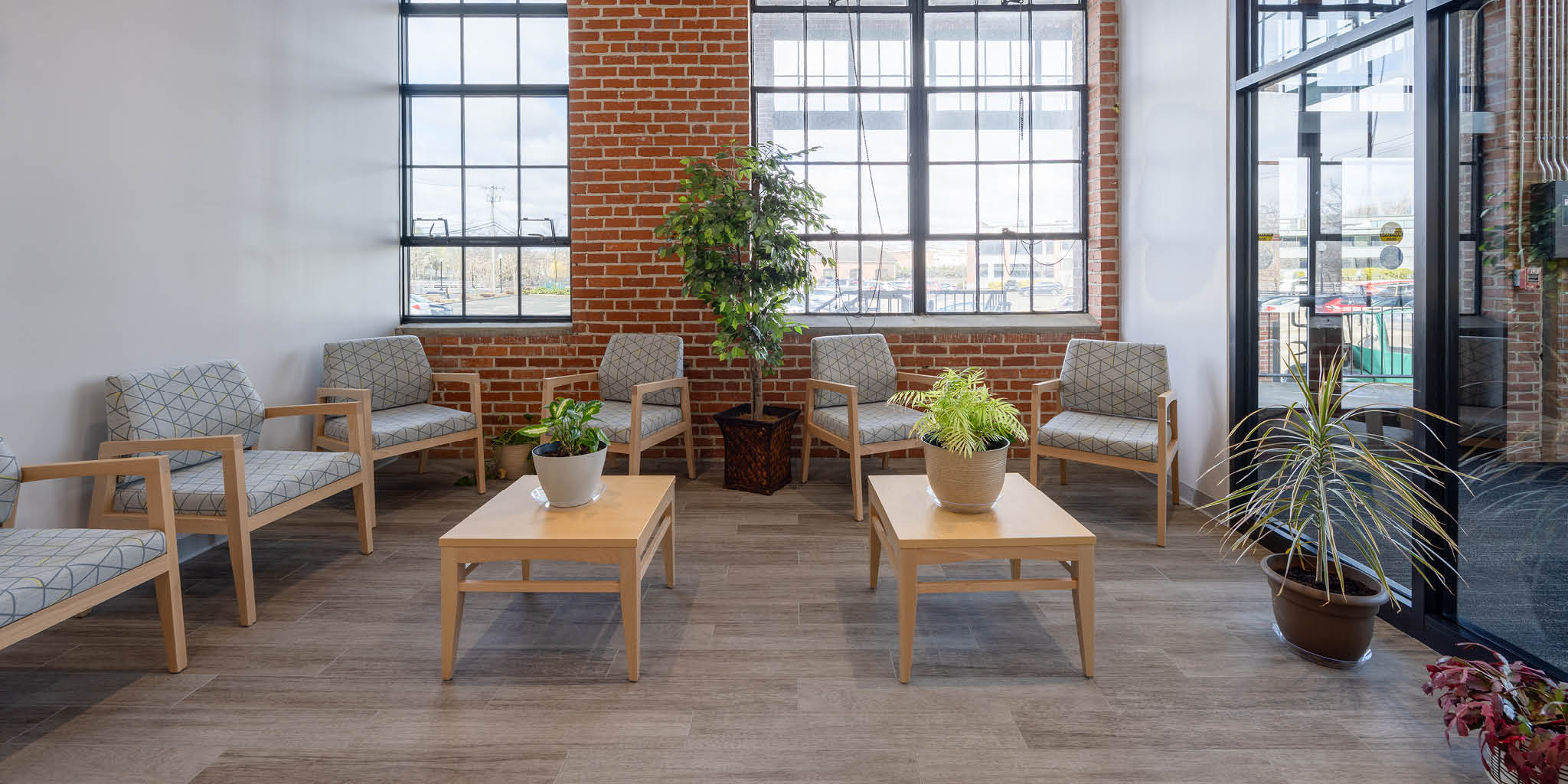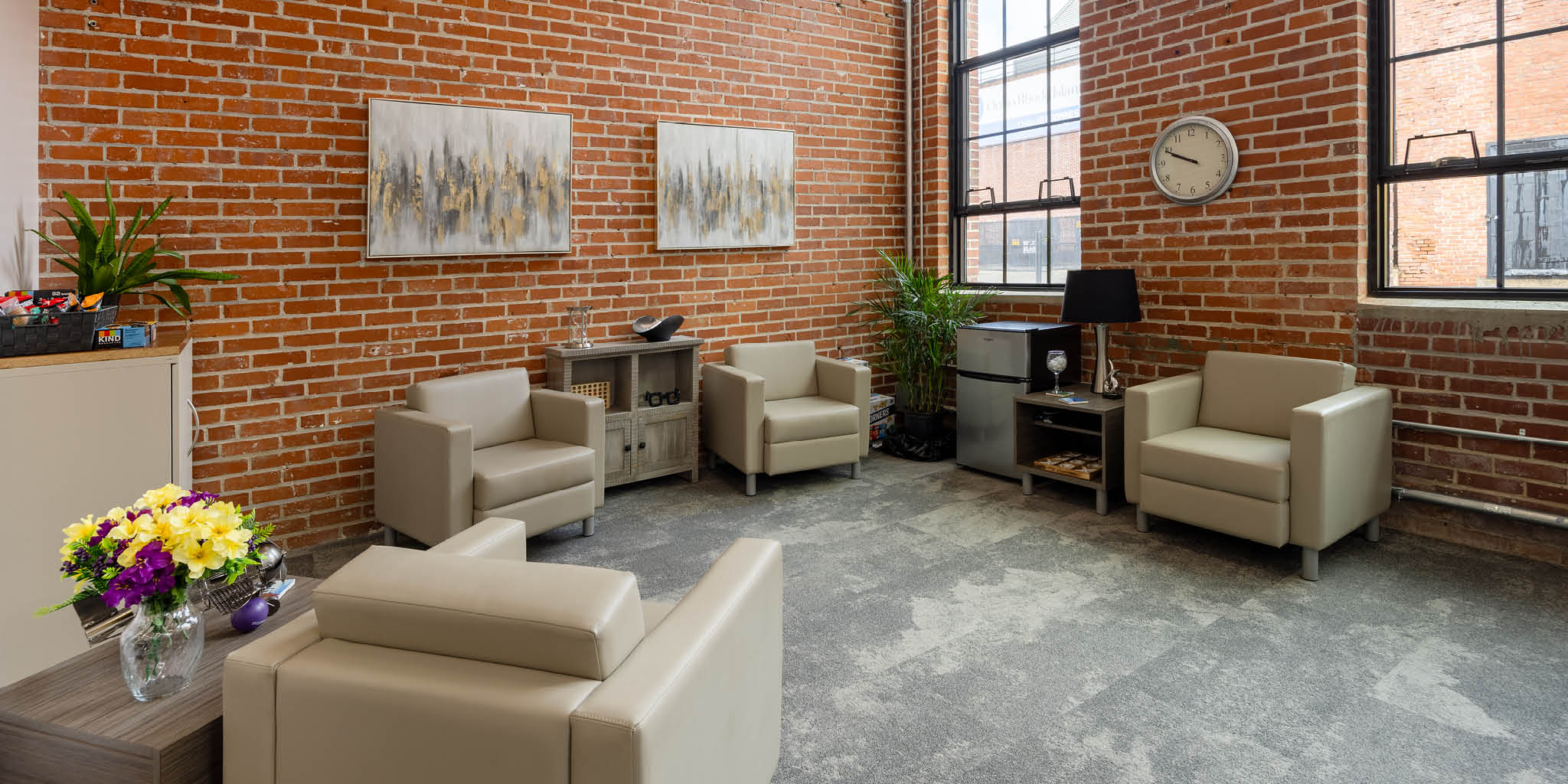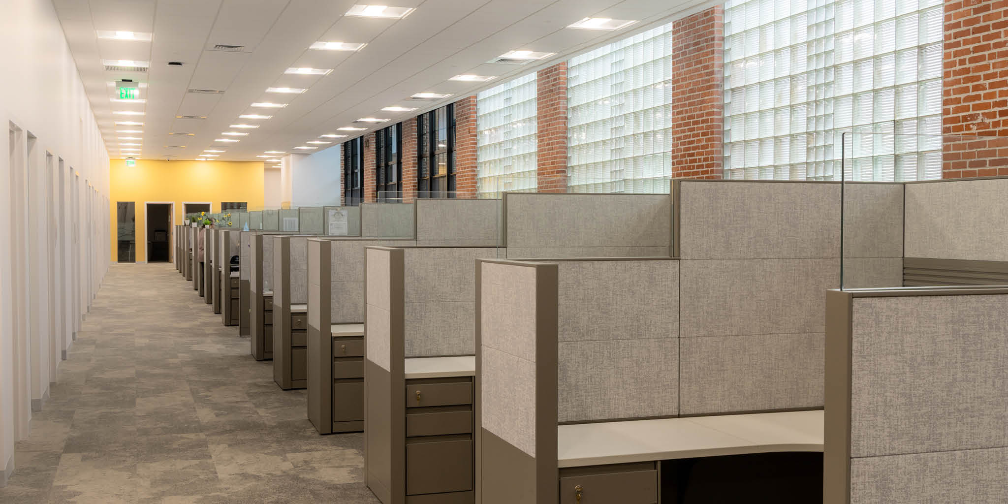 Renovations included all new fit and finish, including a custom reception desk, LED light fixtures, bathroom finishes, kitchen finishes, and more.
